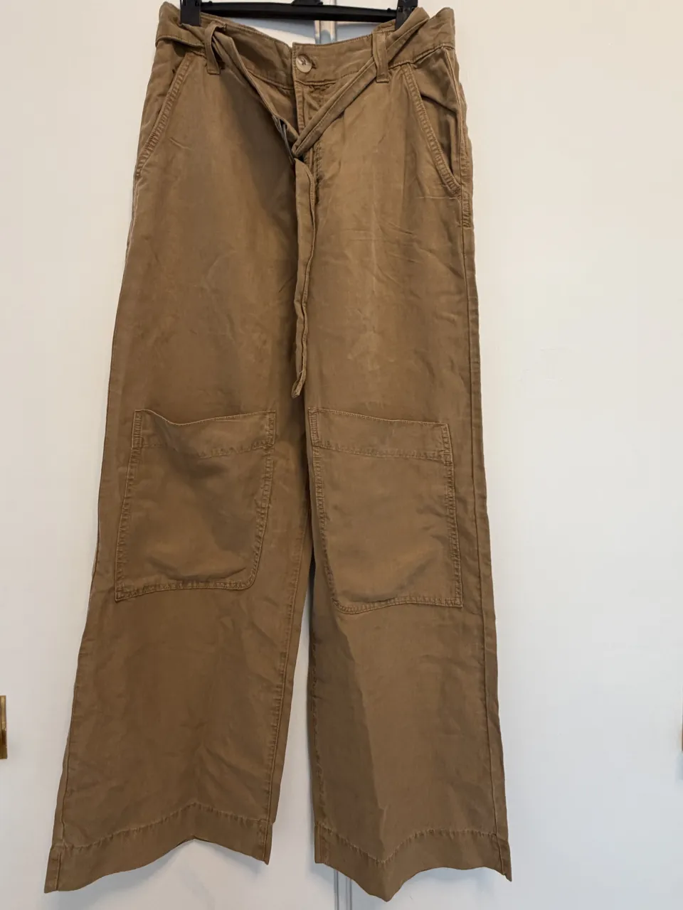 Pantalón de gabardina color marrón con cinturón de tela y bolsillos cargo. Muy liviano. Recto y amplio.