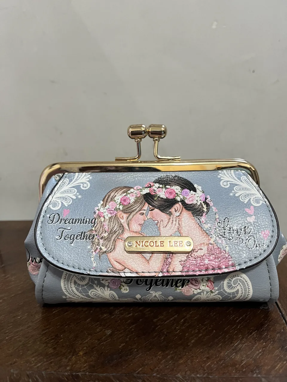Monedero con cierre y broche metálico. Estampado de dos mujeres con flores en la cabeza y la frase "Dreaming Together". Detalle de encaje y flores en la parte inferior. Interior con estampado de lunares.