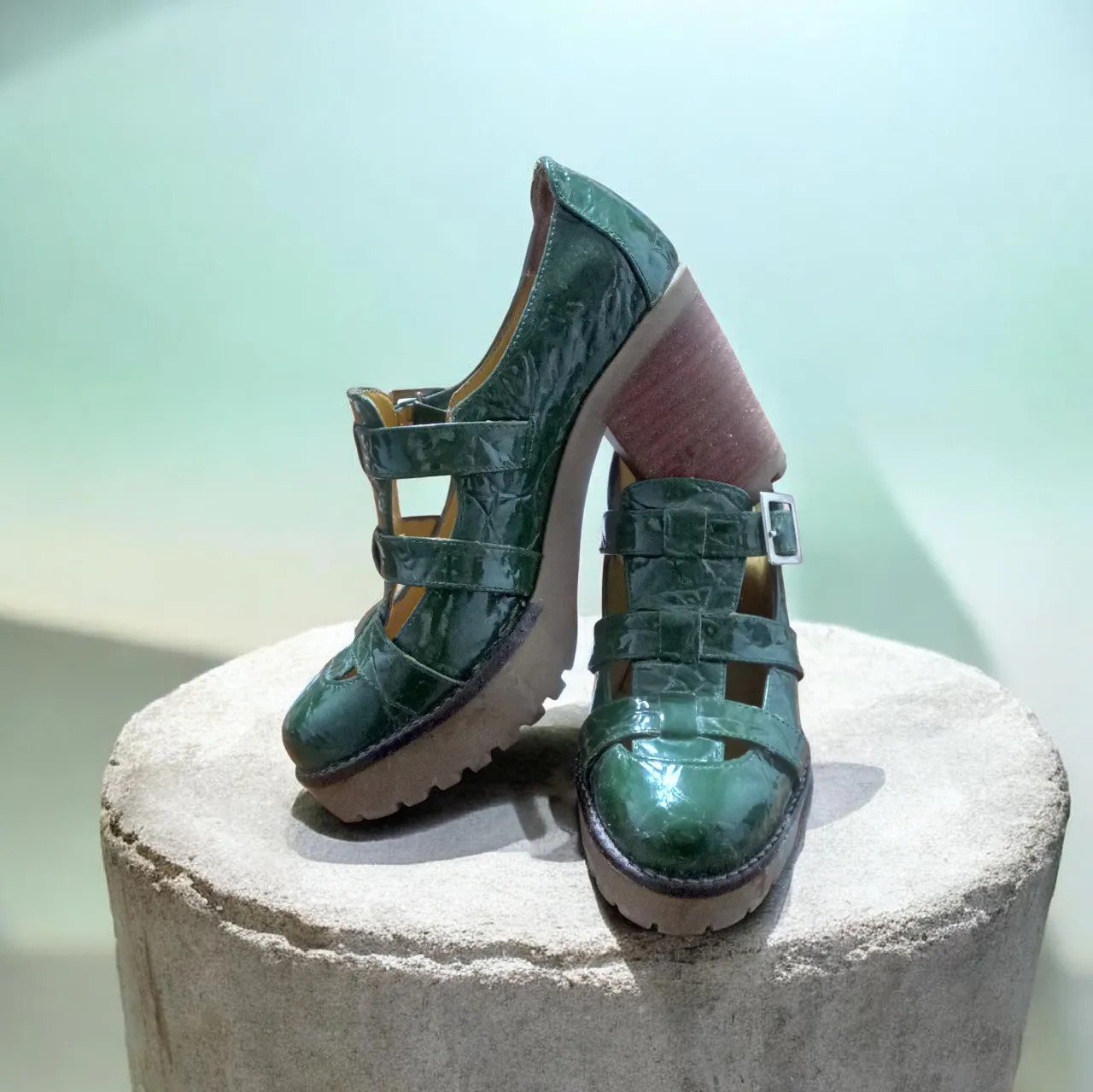 Zapatos verdes con tiras y hebilla. Taco grueso.