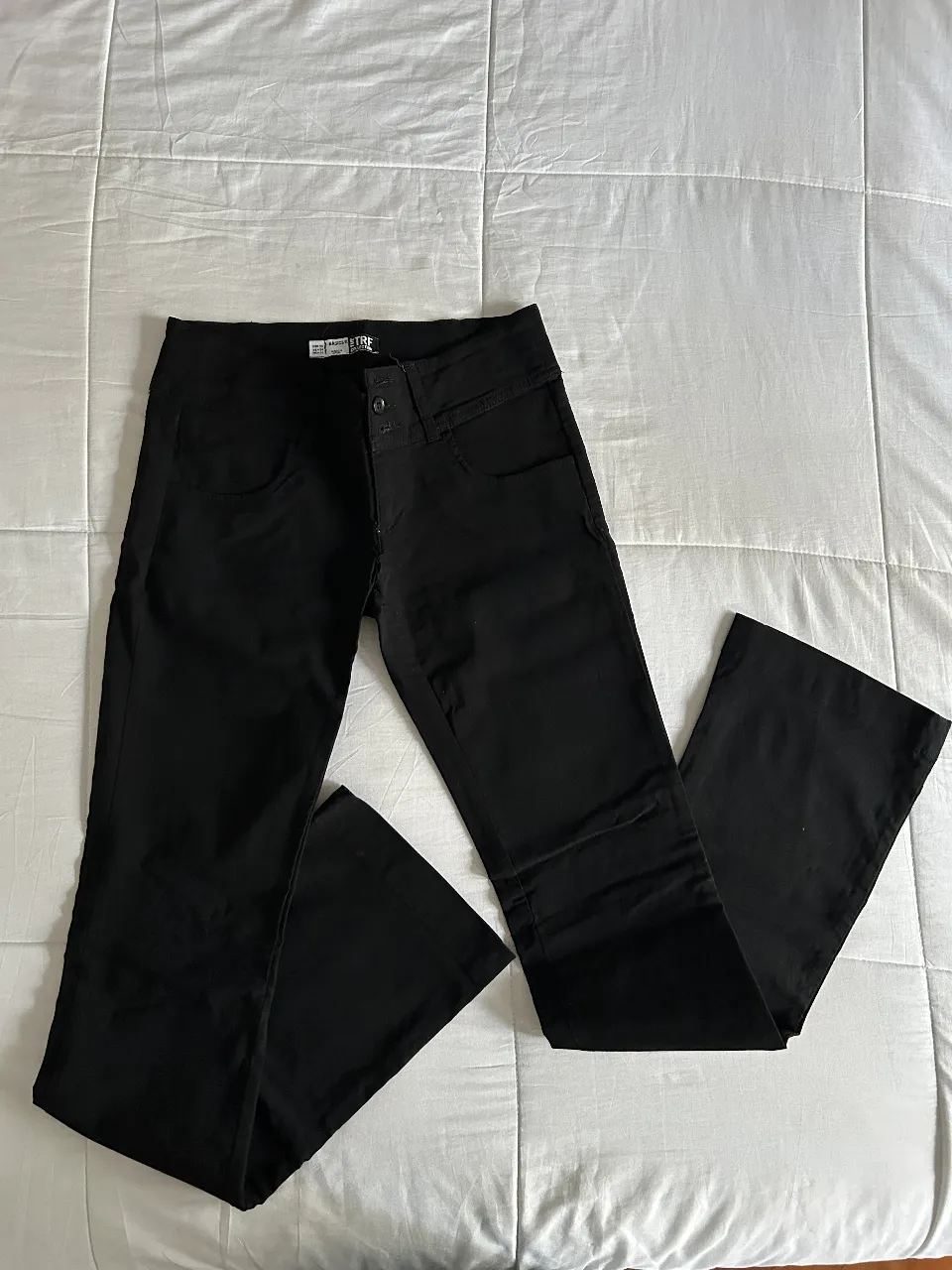 Pantalón negro tiro alto con tres botones al frente. Corte recto con bota ancha. Ideal para un look casual o para ir a trabajar.