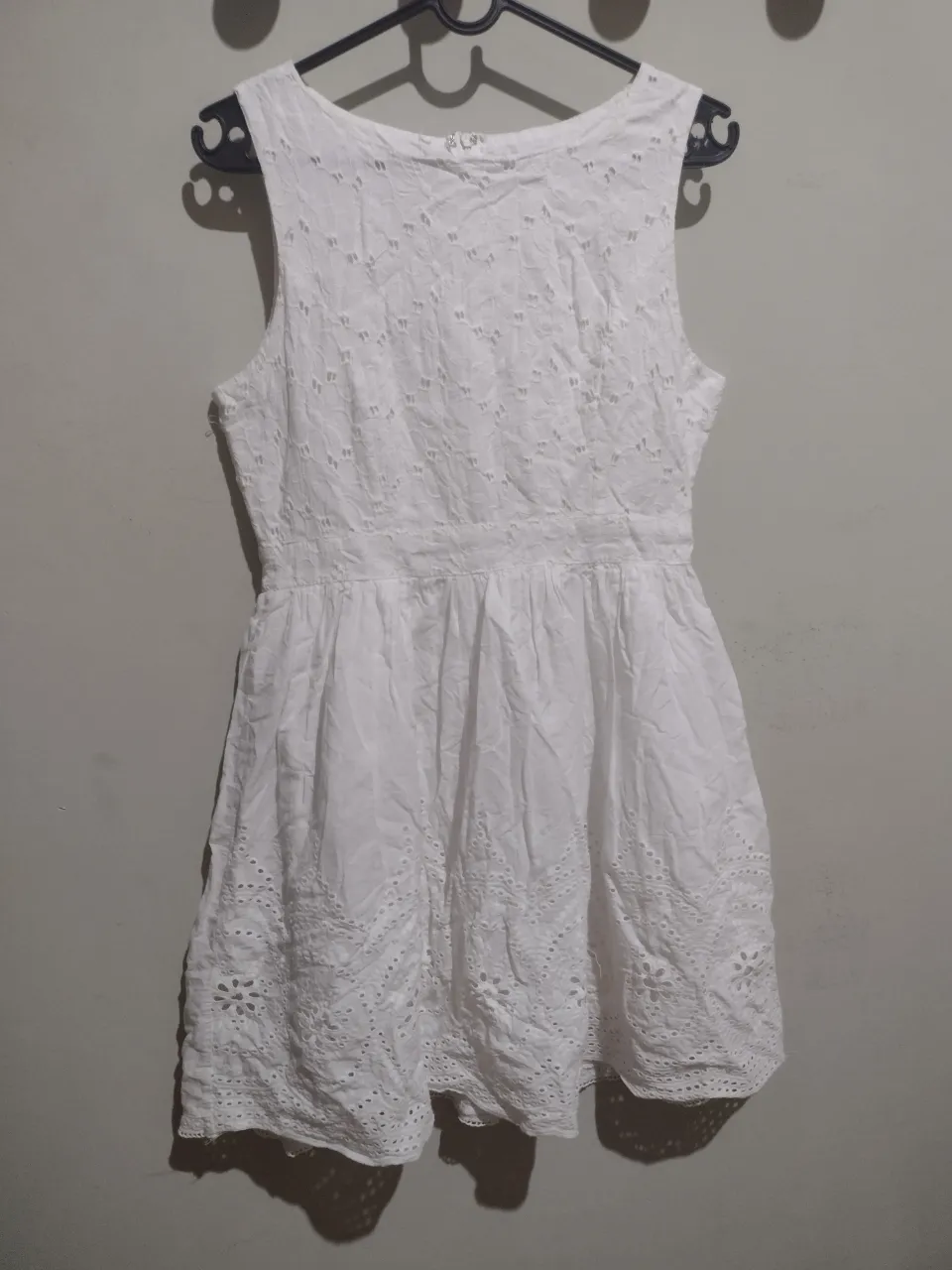 Vestido blanco sin mangas con bordados y detalles de puntilla en el ruedo. Cierre en la espalda.