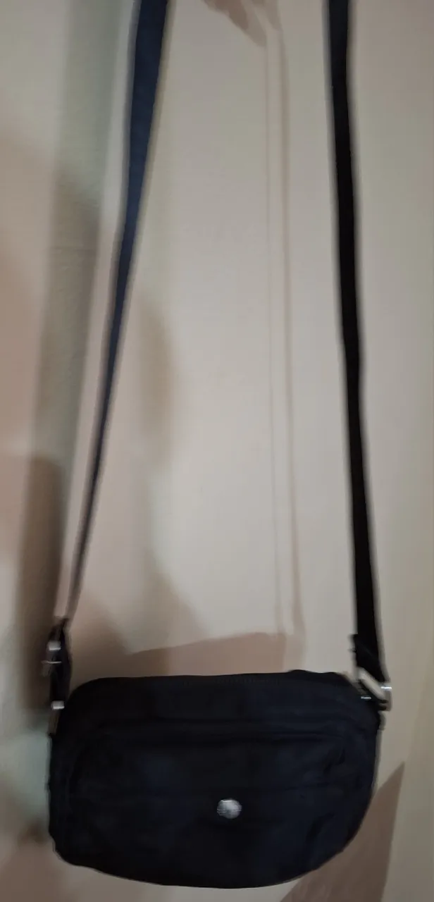 Cartera negra con correa ajustable y detalle metálico al frente.