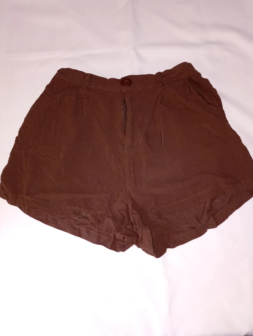 Shorts de lino color marrón, tiro alto con botón y cierre. Ideales para un look casual y cómodo.
