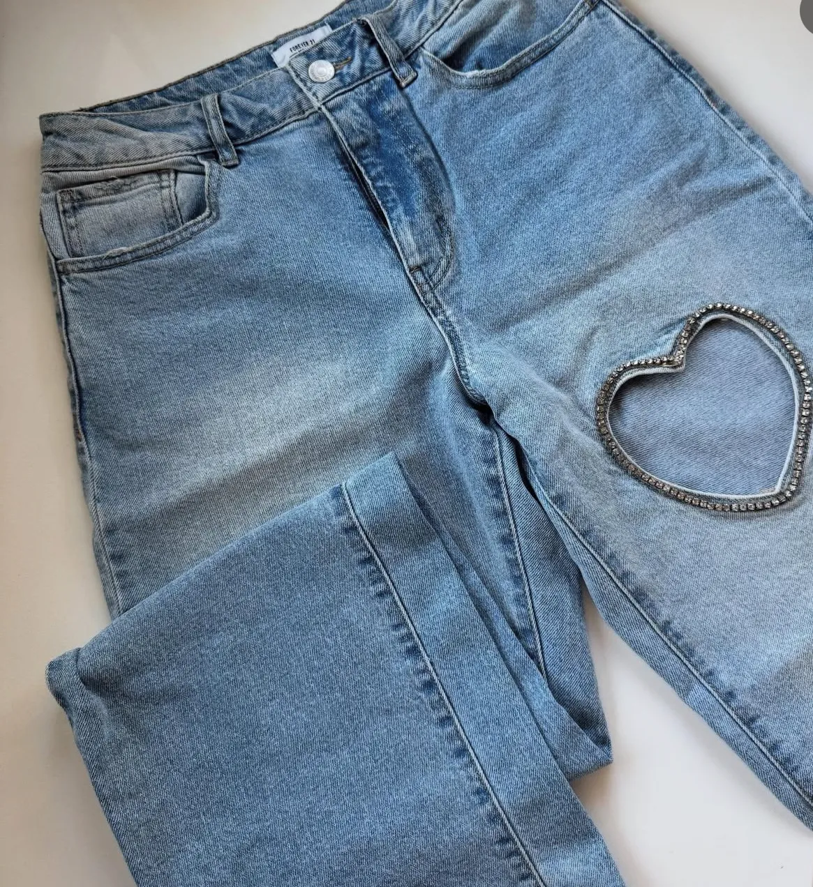 Jeans tiro alto de denim celeste con rotura en forma de corazón con strass en la rodilla. Un diseño único y canchero para destacar tu outfit.