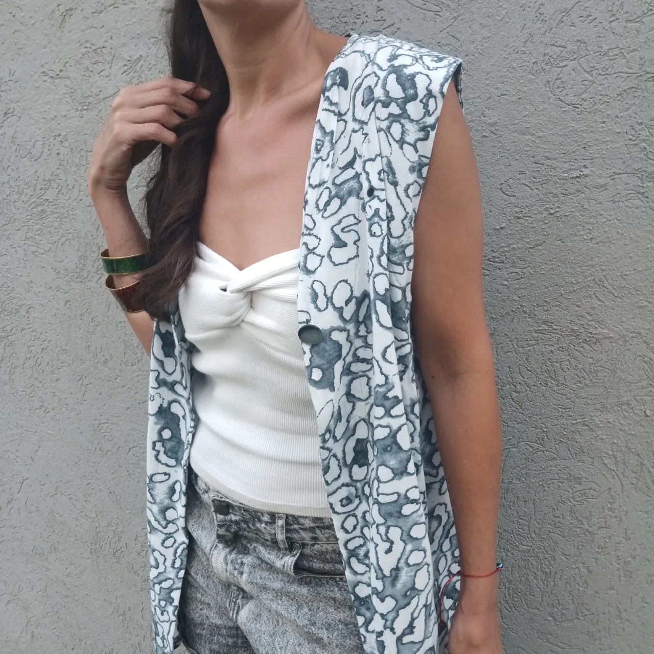 Chaleco largo estampado en blanco y gris. Posee botones al frente.
