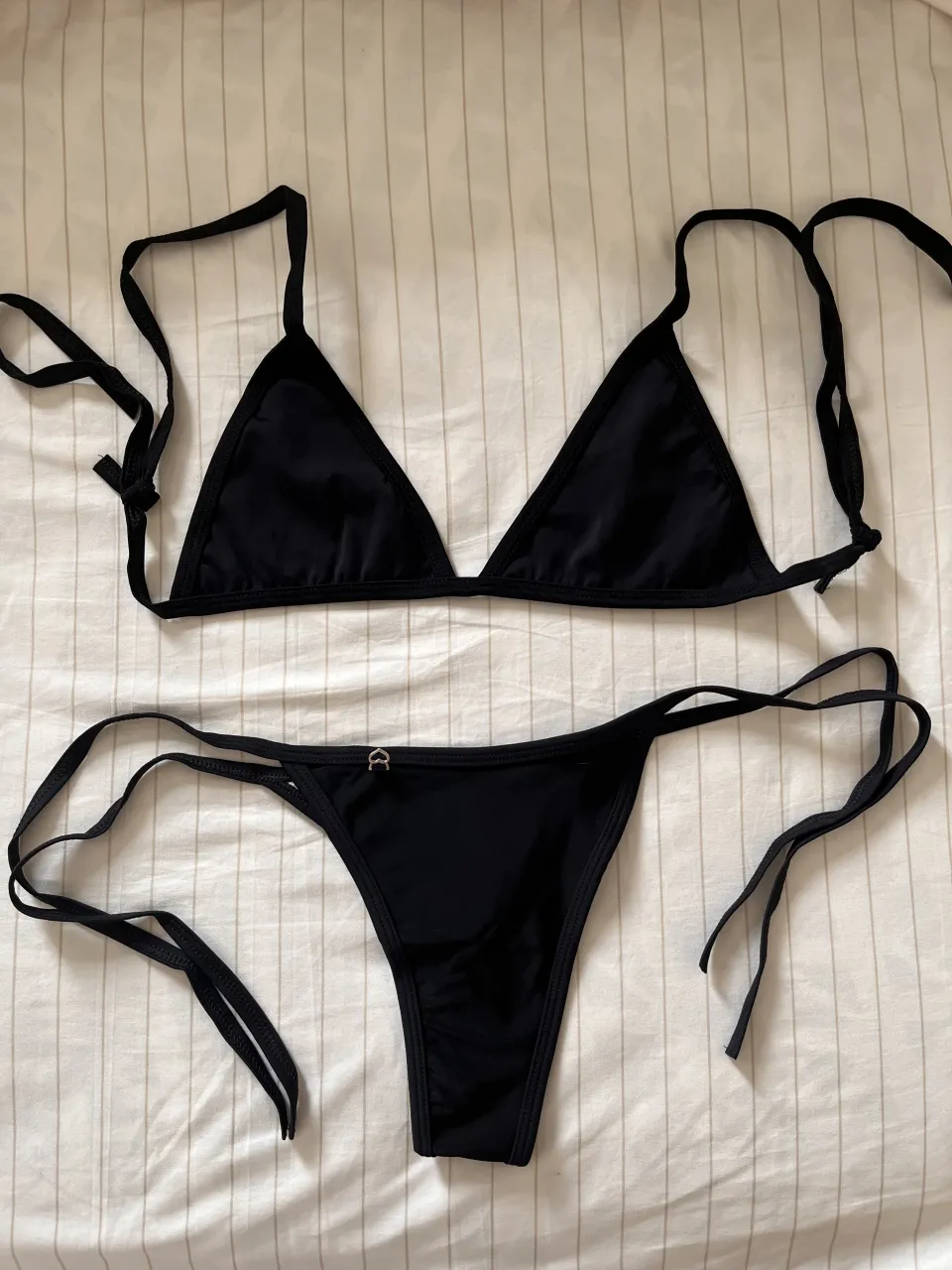 Bikini negra de dos piezas. El corpiño es triangular con tiras finas para atar en cuello y espalda. La bombacha es tipo colaless con tiras finas para atar a los costados. Nueva sin uso