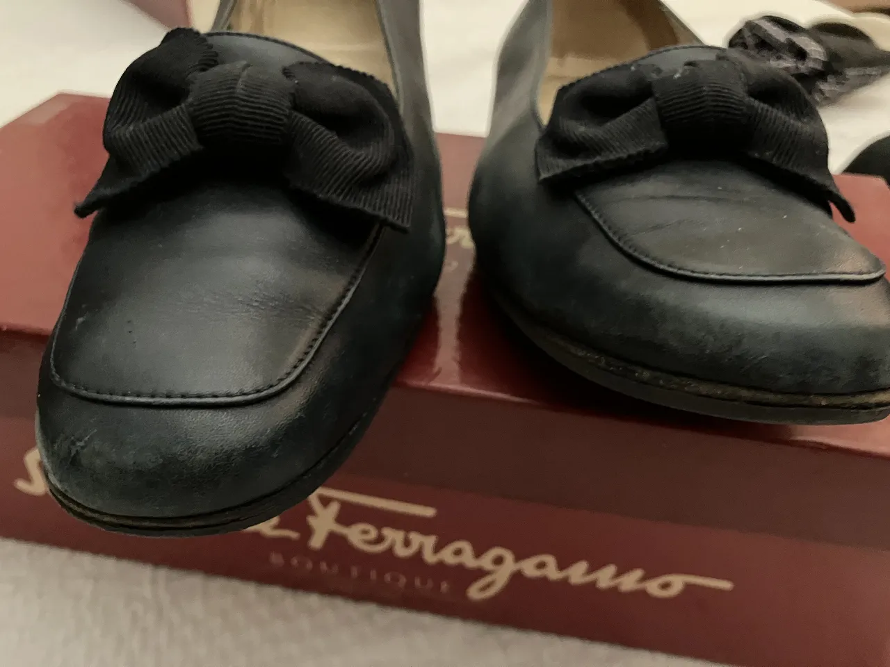 Zapatos bajos azules de cuero con moño. Talle 37 1/2. Ideales para un look elegante y sofisticado, perfectos para el día a día o para complementar un outfit de trabajo. La marca es Salvatore Ferragamo.