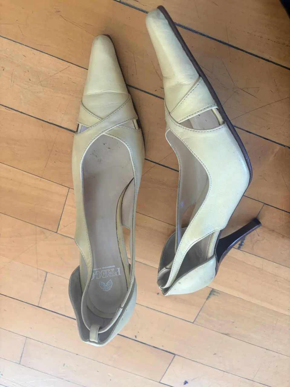 Zapatos Prego cuero de taco alto color amarillo pálido con tiras cruzadas en el empeine y tiras traseras. Punta fina.