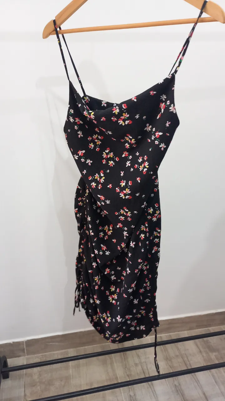 Vestido negro con estampado floral súper delicado y femenino. Tiene breteles finitos, escote drapeado, se ajusta en ambos laterales según el largo que quieras. Tiene cierre invisible en centro de espalda. es de gasa con forro interno. Es talle m, no sede. Esta impecable, sin detalles.