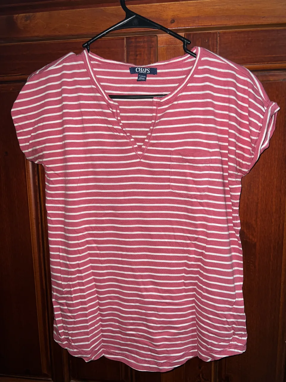 Remera a rayas rosas y blancas con bolsillo en el frente.