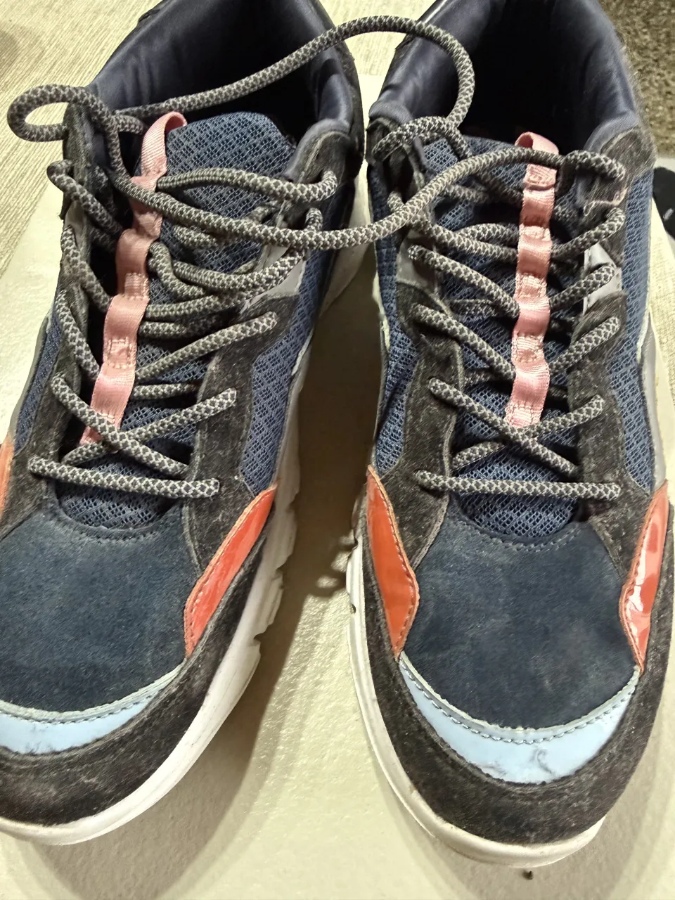 Zapatillas deportivas con cordones, combinando paneles de gamuza azul marino, tela de malla azul y detalles en naranja, gris y amarillo. Suela blanca con detalles negros. Usadas. muy buen estado