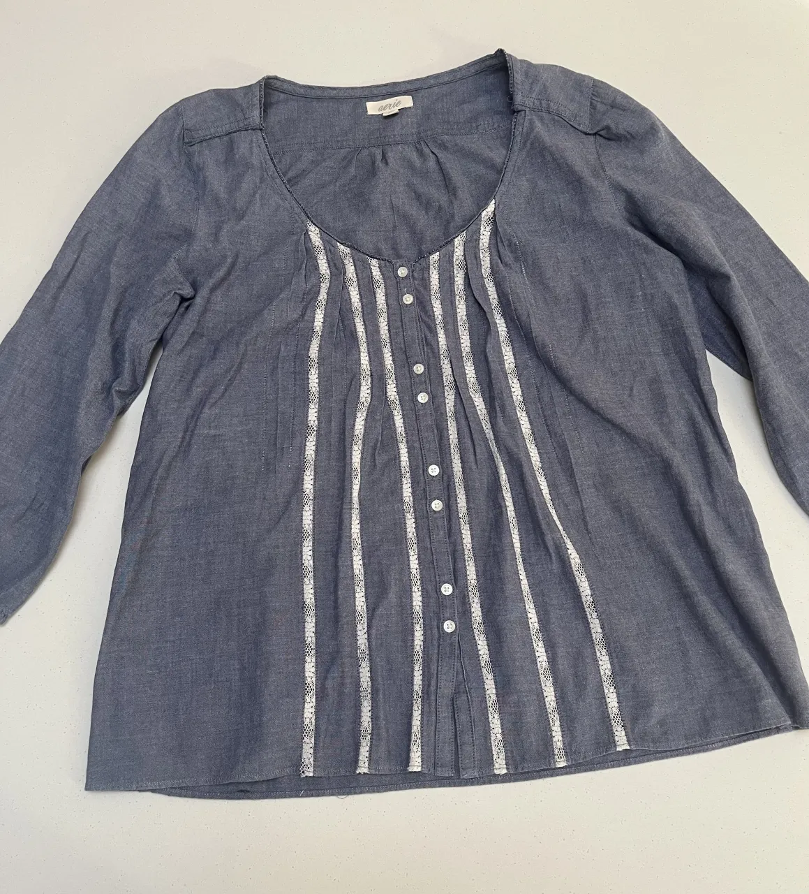 Remera de manga larga en color azul, con detalles de puntilla blanca en el frente y botones. Ideal para un look casual y cómodo.