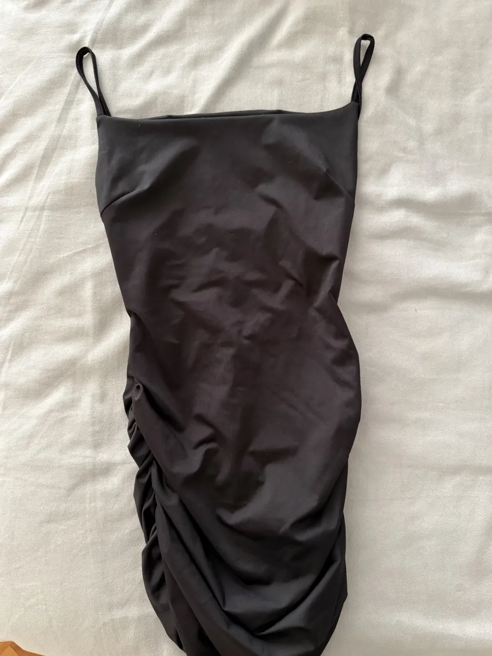 Vestido negro súper canchero, ideal para una salida o fiesta. Tiene un diseño fruncido que estiliza la figura y un detalle cut-out en la espalda que le da un toque moderno. ¡No te lo pierdas!