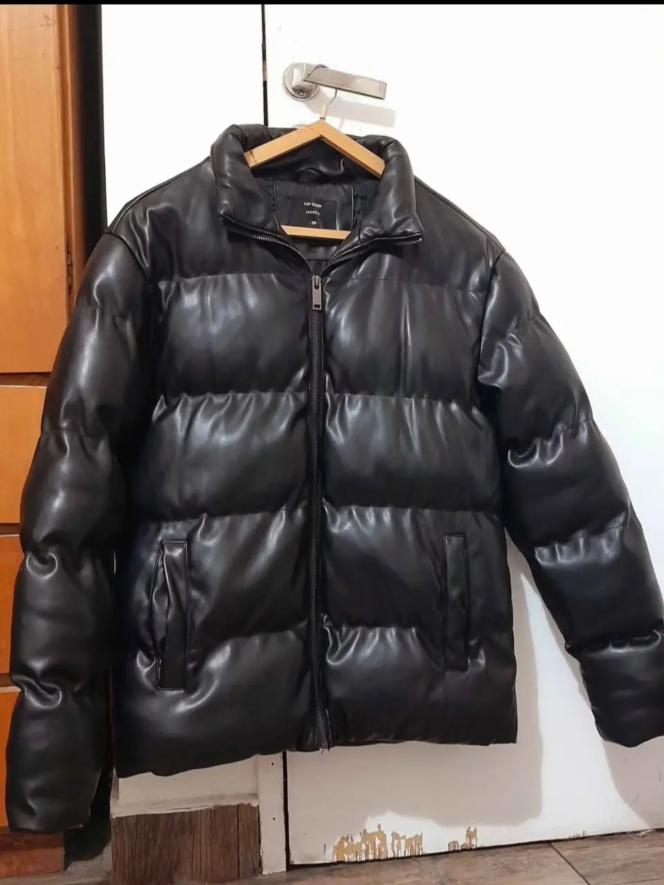 Campera puffer de cuero sintético negra para hombre o mujer, con cuello alto y cierre. Ideal para el invierno, estilo casual.