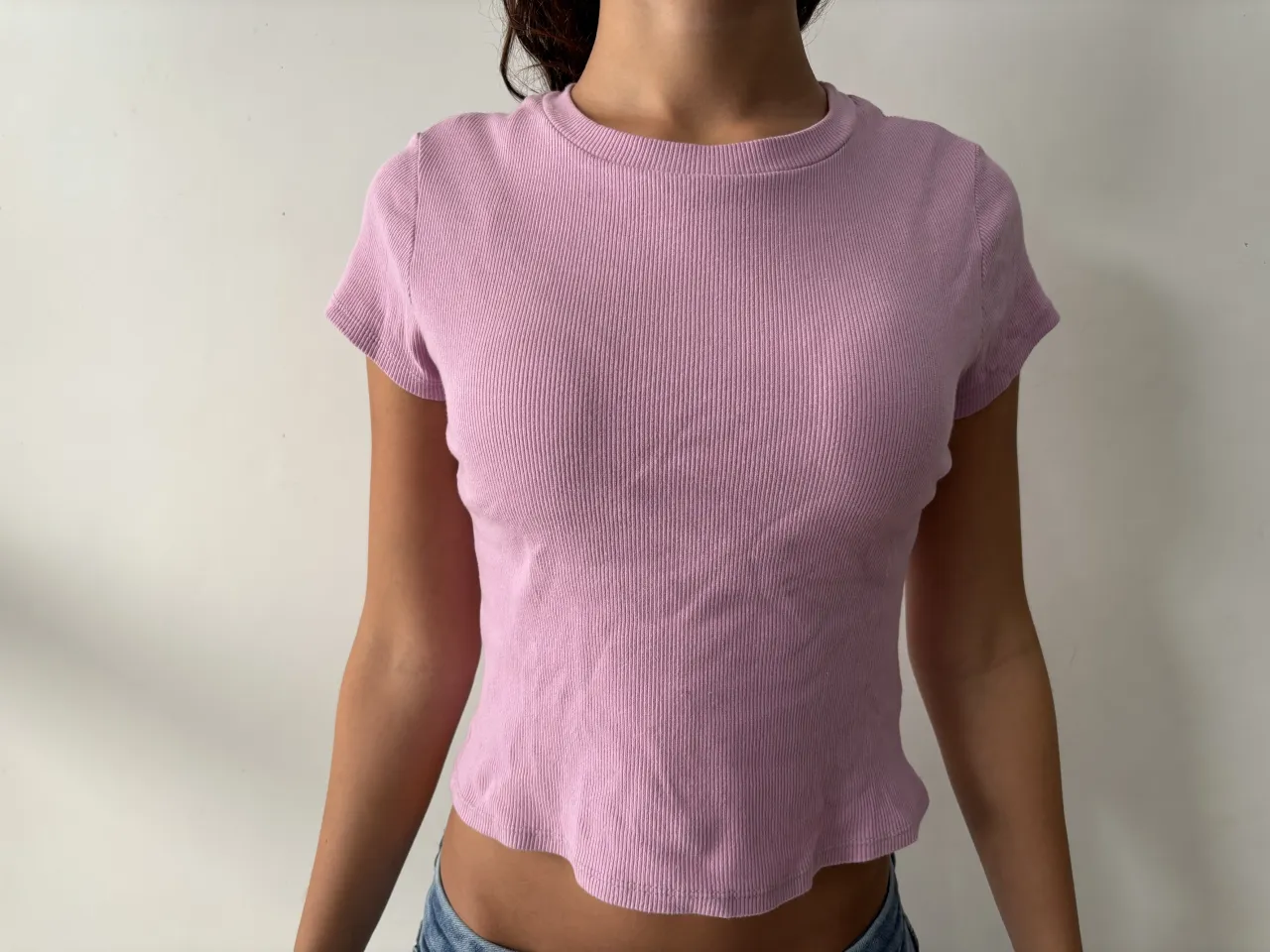 Remera manga corta de algodón acanalado en color rosa pálido. Tiene un corte al cuerpo y cuello redondo. Perfecta para un look casual y cómodo.