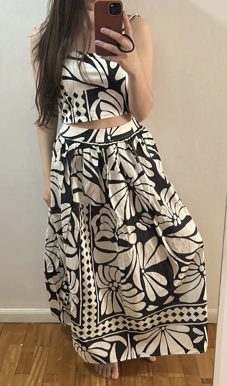 Conjunto de dos piezas: top corto y pollera larga. Ambas prendas tienen un estampado floral grande en blanco y negro. El top es de breteles finos y la pollera es de cintura alta. Corresponde a un talle xs/s. SIN USO.