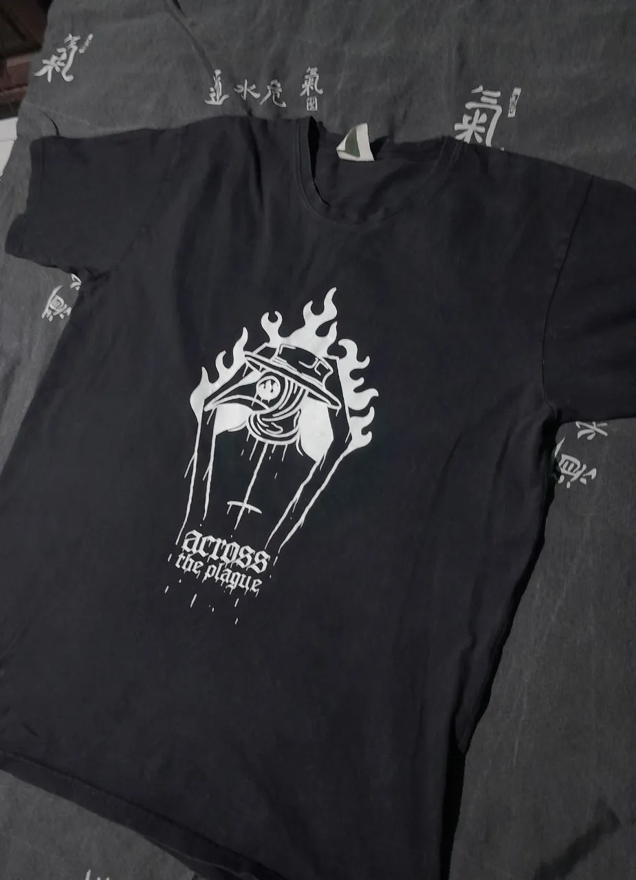 Remera negra AcrossTheRainbow ,con estampa "across the plague" de un personaje con máscara de doctor de la peste y llamas. Ideal para un look urbano y con onda.