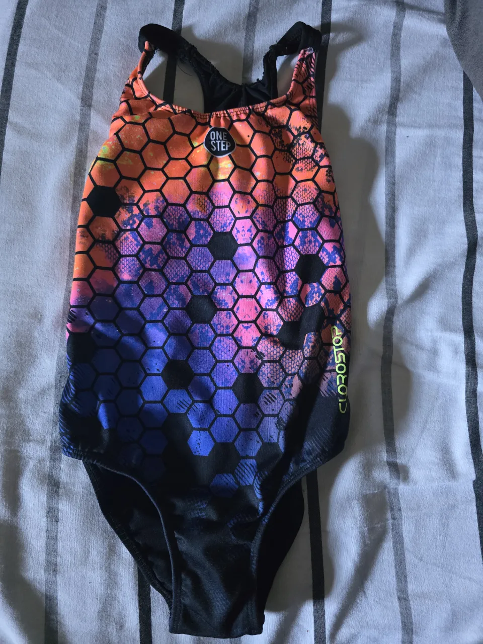 ¡Llamá la atención con este traje de baño súper original! Diseño vibrante con estampado de hexágonos en degradé de naranja, rosa, violeta y azul. Ideal para destacar en la pileta o la playa. ¡Un toque moderno y deportivo para tus días de sol!