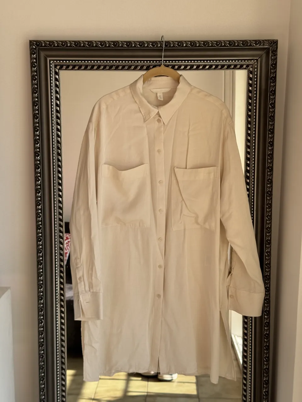 Camisa larga de color crudo, con botones al frente y dos bolsillos en el pecho. Ideal para un look casual y cómodo.