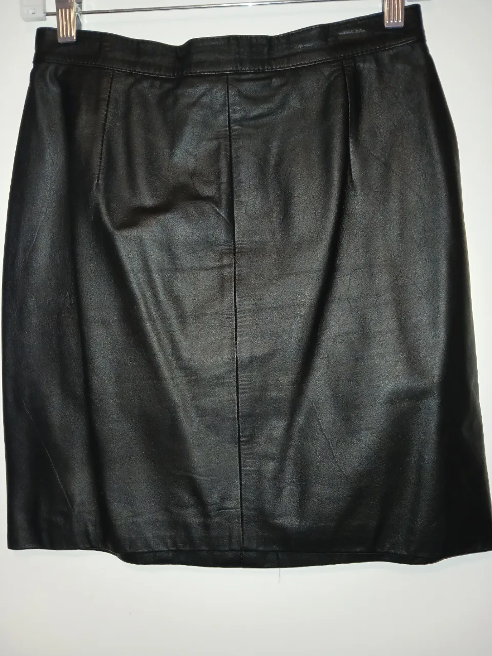 Pollera de cuero negra, tiro alto, con detalles de costura y un corte clásico. Ideal para un look canchero y moderno. Forrada. cuero auténtico. Contorno cintura 0.70 cm. largo total 0.48 cm. contorno cadera 0.96 cm