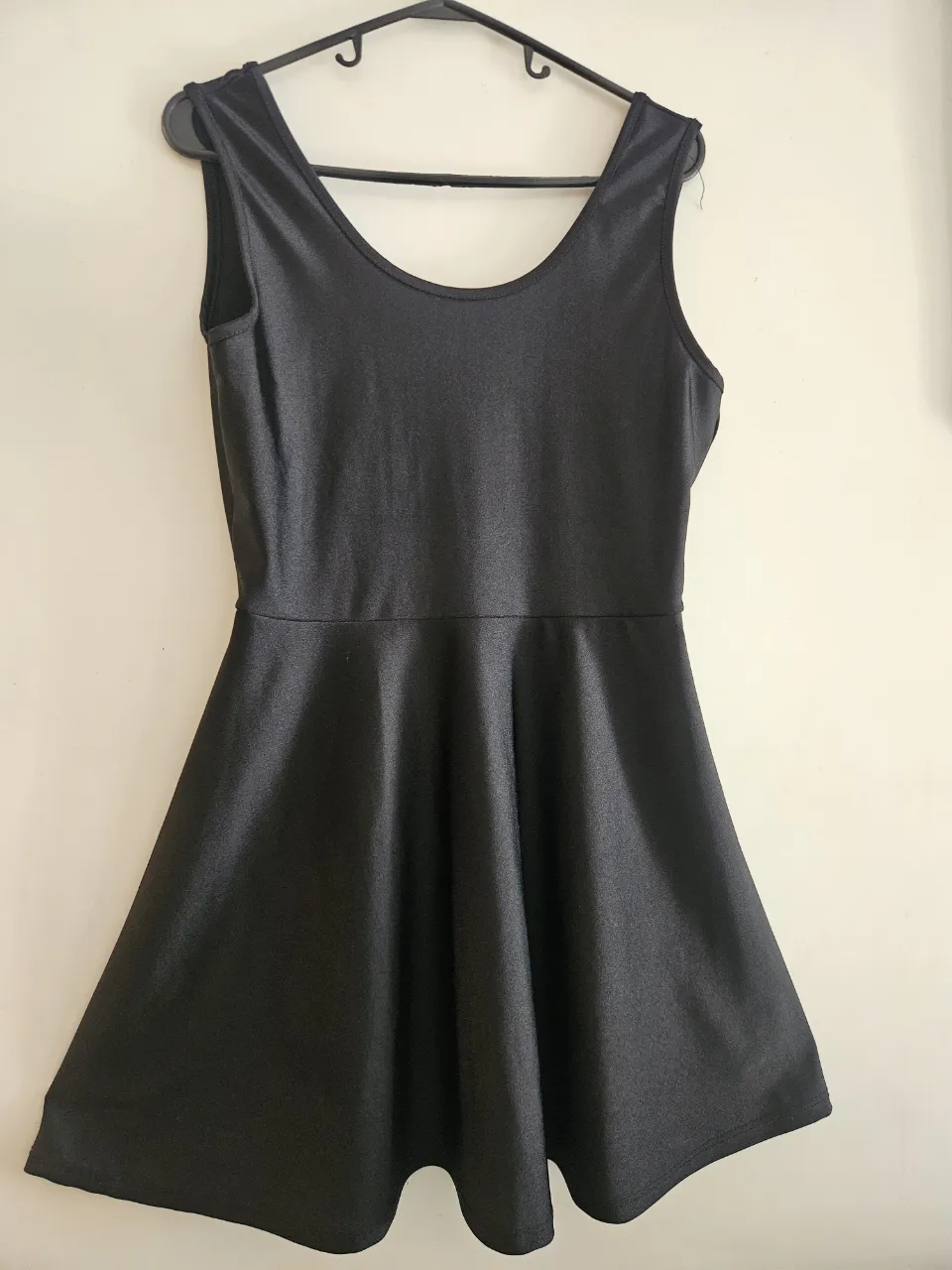 Vestido negro corto, sin mangas y con escote redondo. La parte superior es ajustada y la falda es amplia y con mucho movimiento. Ideal para cualquier salida o fiesta.