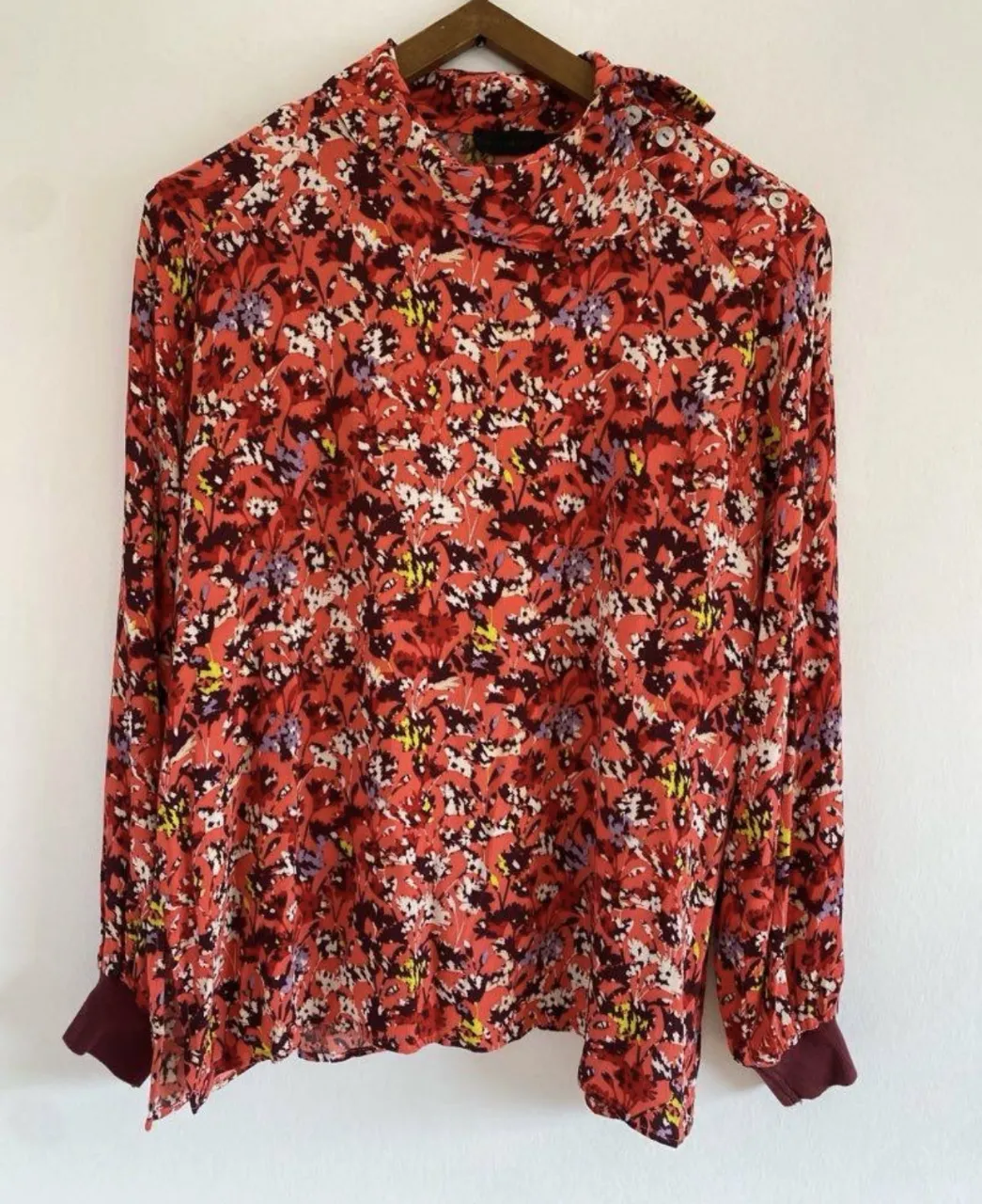 camisa manga larga con estampa floral vibrante en tonos rojos, blancos, amarillos y lilas. Cuello alto con detalle de botones y puños ajustados. Perfecta para un look casual y chic. talle 40 amplio