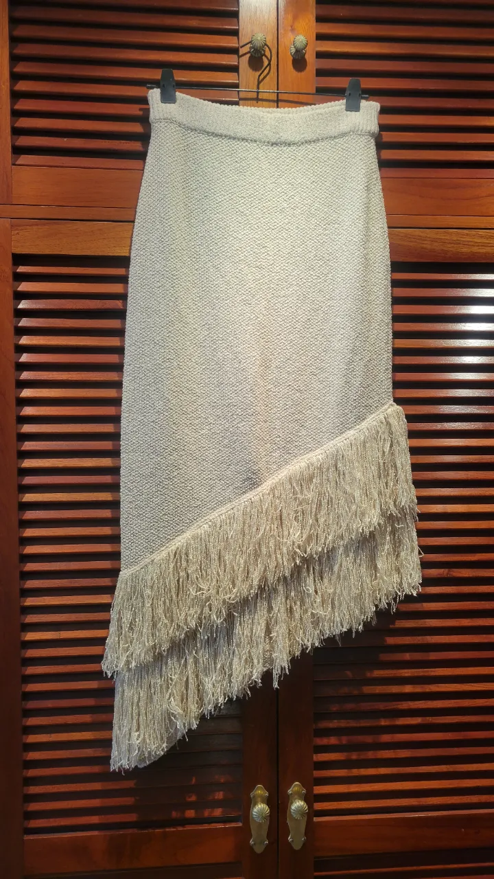 Pollera tejida con flecos, diseño asimétrico y moderno. Ideal para un look canchero y con onda.