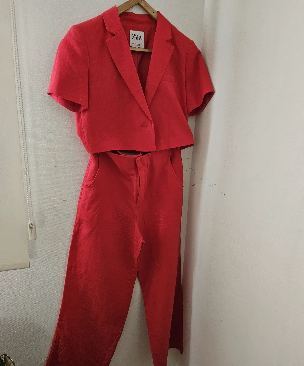 Conjunto de blazer y pantalón palazzo de lino color rojo vibrante. El blazer es corto, con mangas cortas y solapa, ideal para un look moderno y canchero. El pantalón es de tiro alto, con corte ancho y pierna recta, súper cómodo y elegante. Perfecto para eventos de día o noche, o para darle un toque chic a tu outfit.