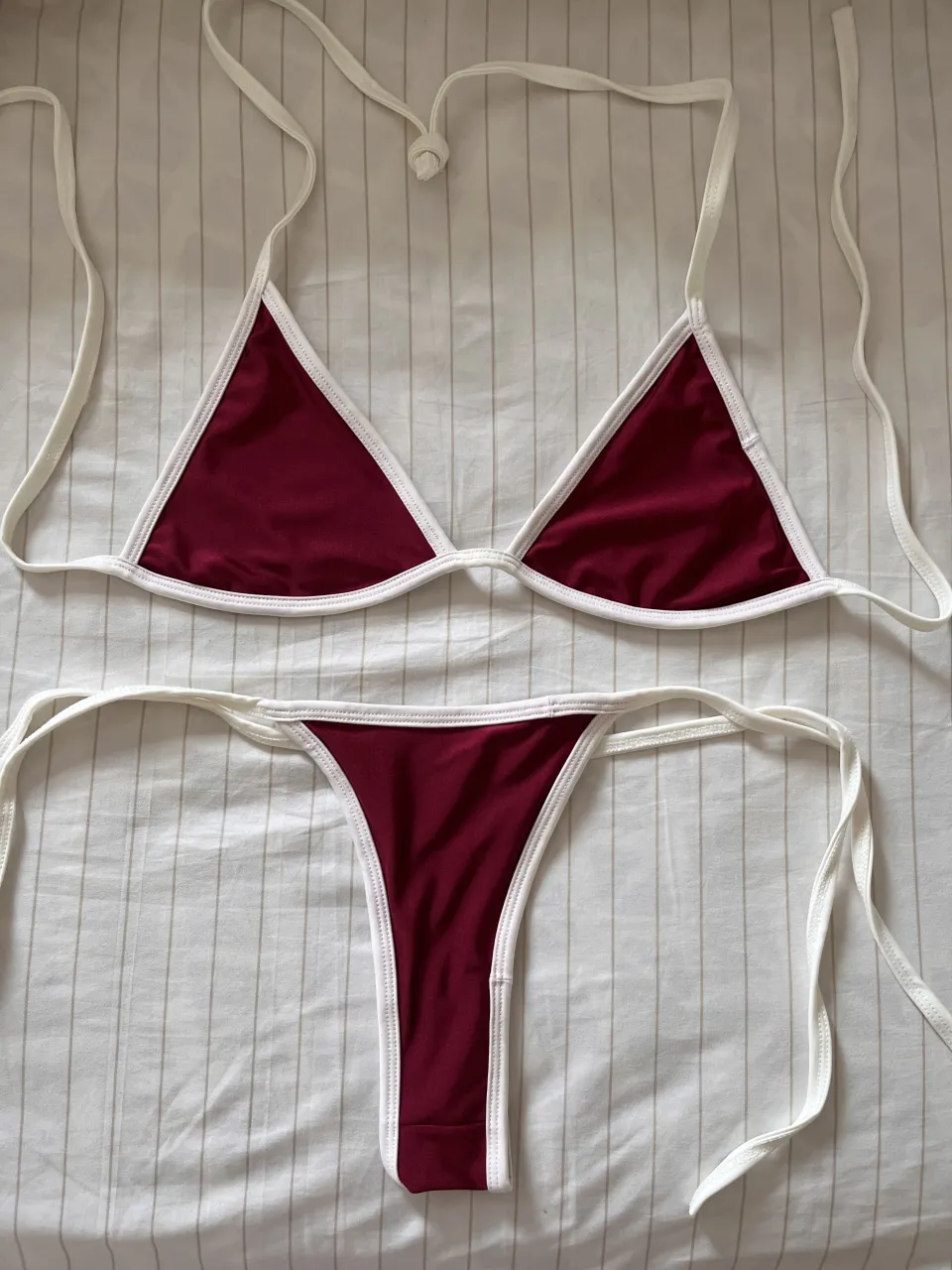 Bikini de dos piezas color bordó con vivos blancos. Breteles finos regulables con nudo. Nueva sin uso