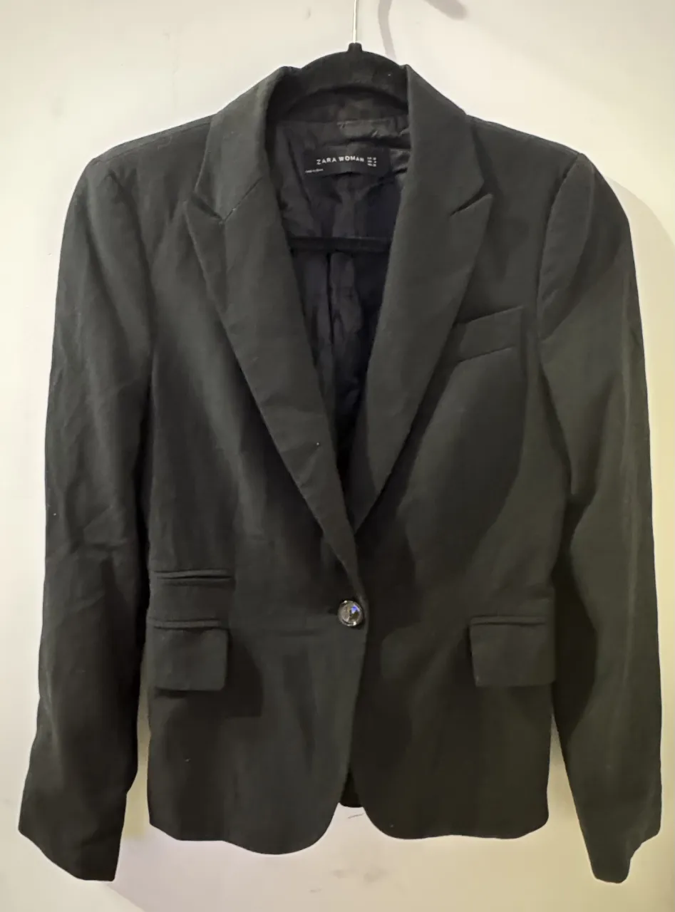 Blazer negro de Zara Woman con un botón al frente y bolsillos con solapa. Es talle 36.