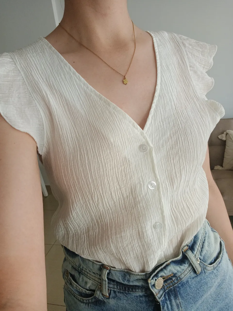 Blusa blanca AMELIA BAIRES con cuello en V y botones funcionales al frente. Posee volados en las mangas. Tela: crepè elastizado. Medidas: contorno de busto 86cm, largo 51cm.