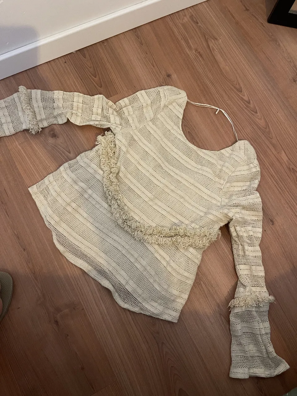 Blusa boho de hilo color crudo con detalles de flecos y tiras para atar en el escote. Mangas largas acampanadas con terminación de flecos. Ideal para un look relajado y con estilo.