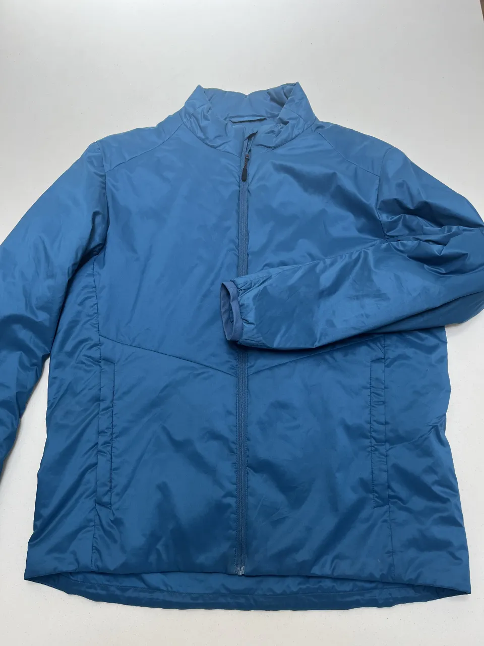 Campera azul con cierre completo y cuello alto. Posee bolsillos laterales con cierre.