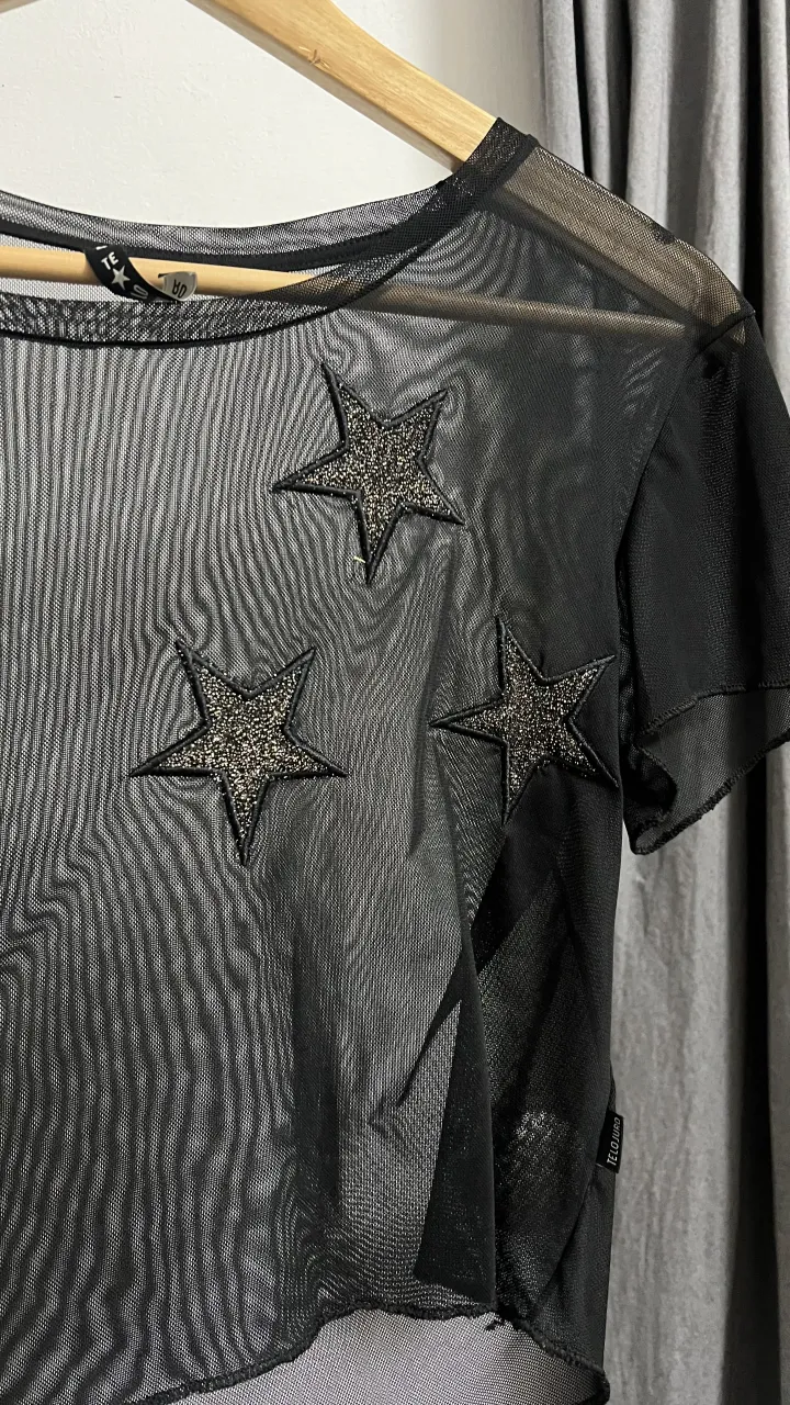 Remera negra de red con estrellas bordadas, manga corta y escote redondo. Un diseño audaz y canchero, ideal para darle un toque rockero a tu look.