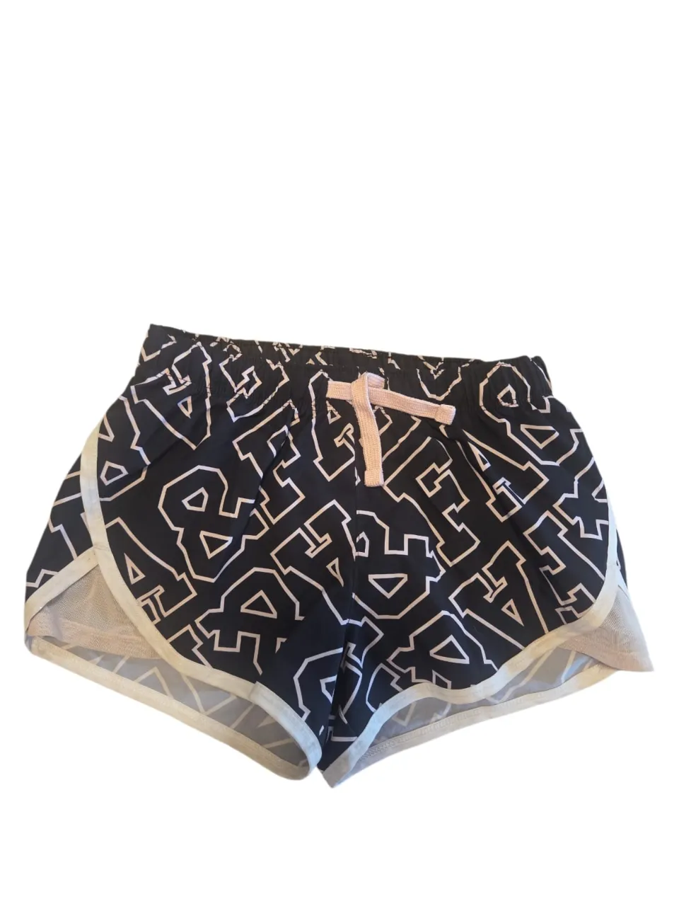Shorts deportivos negros con estampa blanca de letras y cordón rosa en la cintura.
