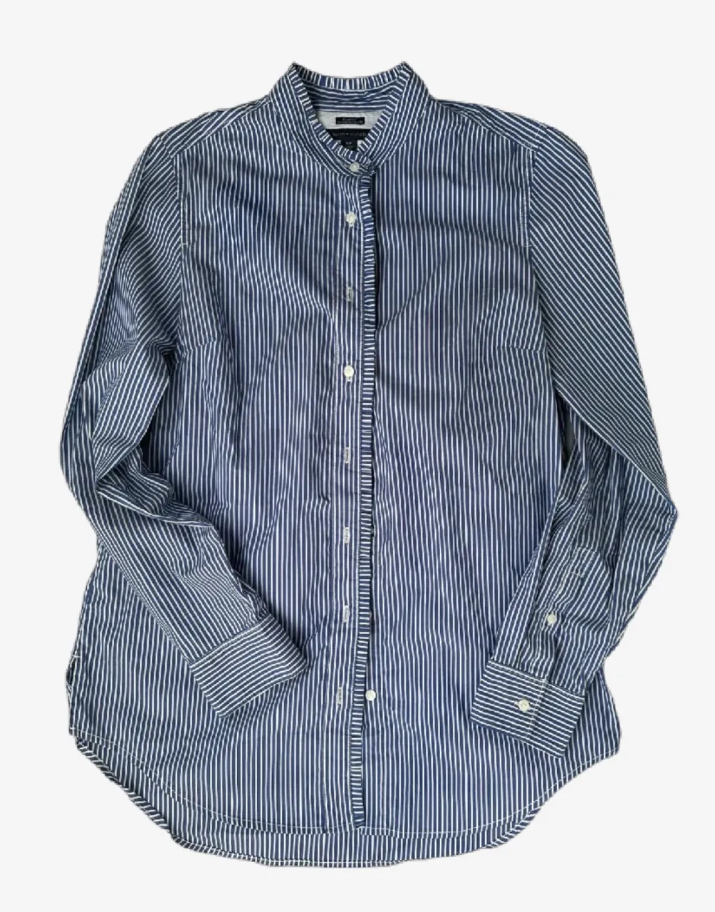 Camisa a rayas azules y blancas, holgada con cuello mao y botones al frente. Ideal para un look versátil, pudiendo lucir casual, fresca y elegante combinándolo con las prendas correctas.