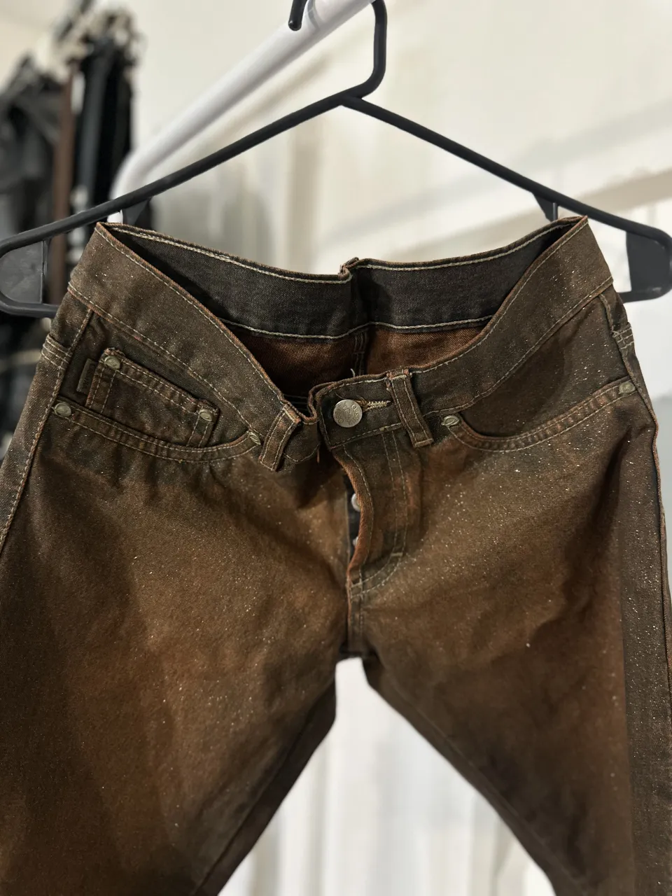 Jean tiro muy bajo marrón con detalles brillantes, medio Oxford en las botas del pantalón, no se que talle es pero es bastante chico!