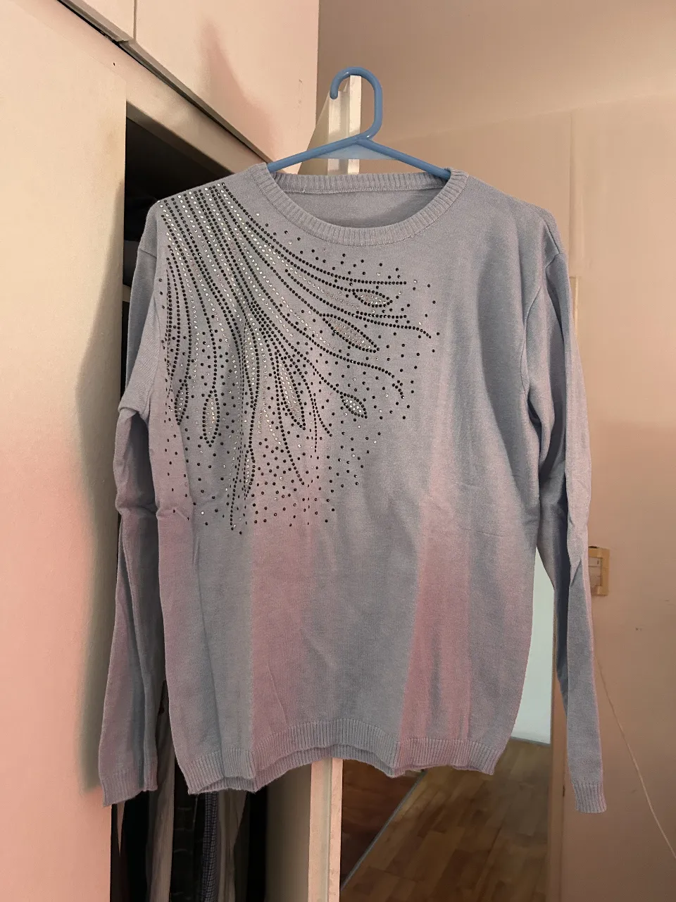 Sweater de hilo color celeste pastel con cuello redondo y manga larga. Posee un delicado diseño de strass plateado y negro en forma de abanico en la parte superior izquierda del frente. Ideal para un look elegante y canchero.