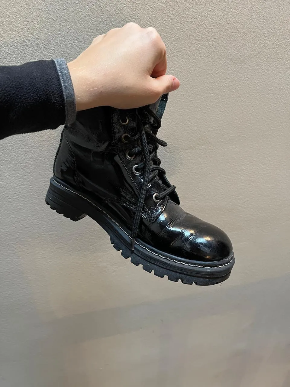 Botitas negras charoladas con cordones, ideales para un look canchero y moderno. Perfectas para el día a día o para darle un toque rockero a tu outfit.