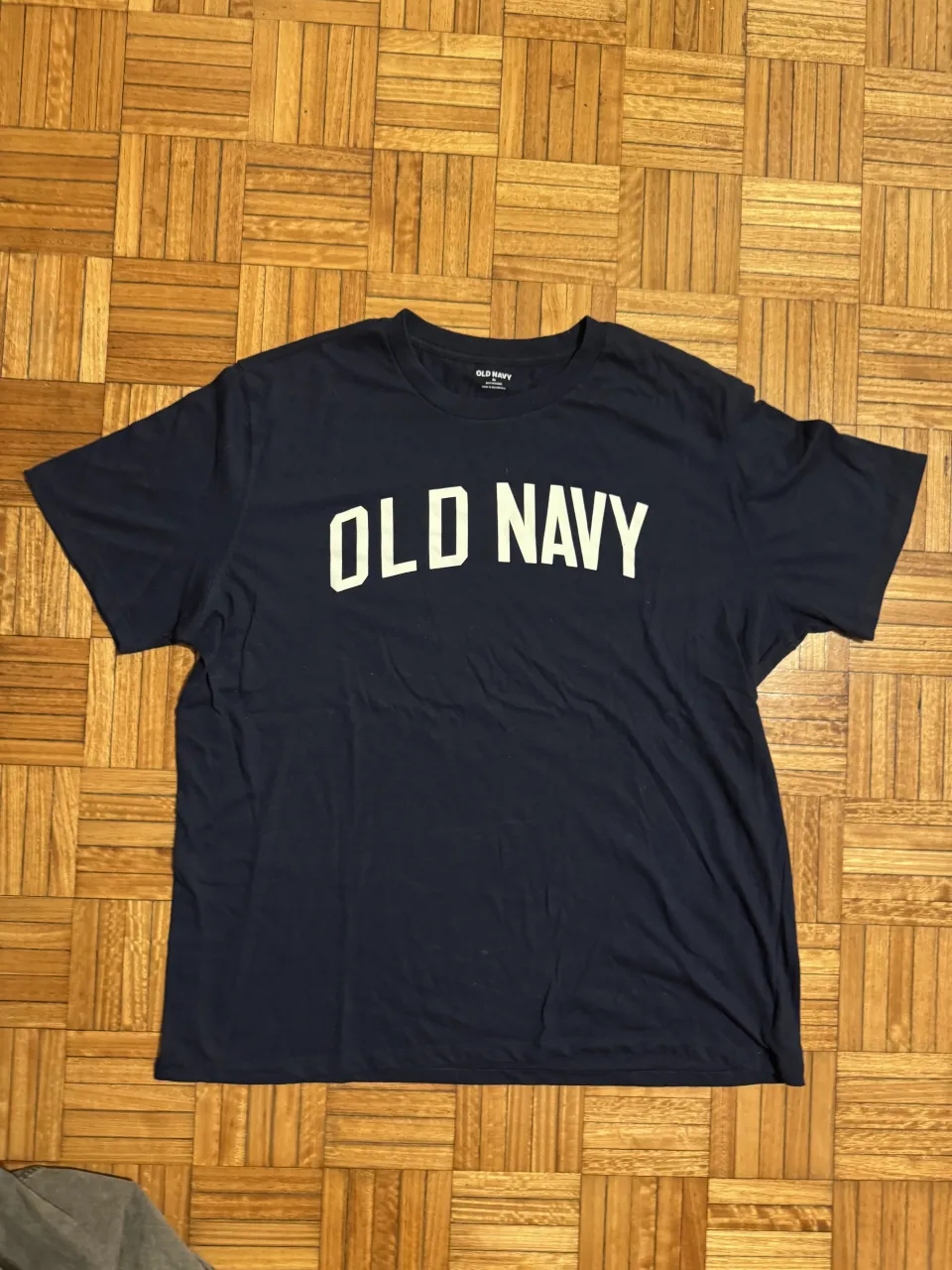 Remera azul marino de manga corta con estampa "OLD NAVY" en blanco. Ideal para un look casual y cómodo.