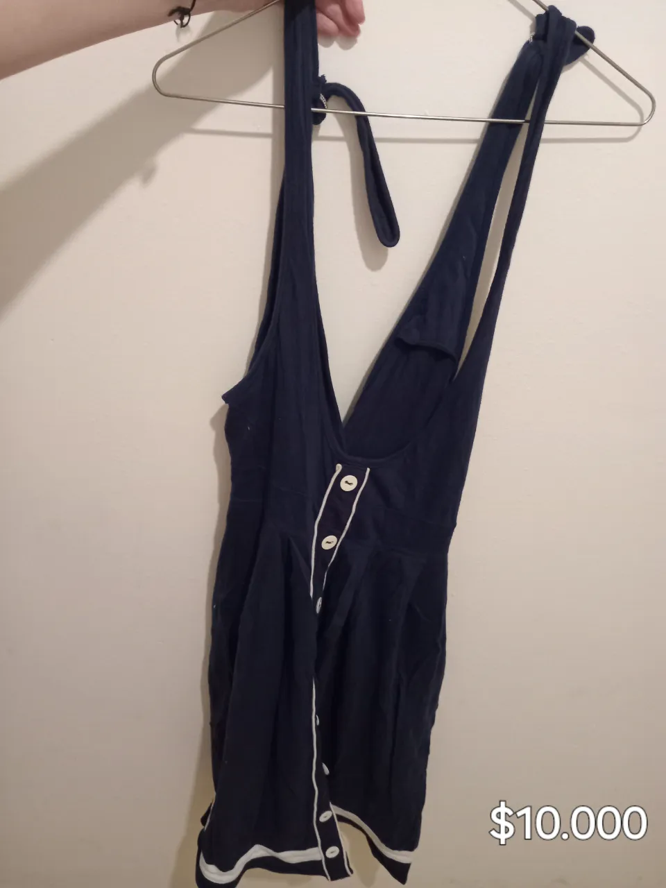 Vestido azul marino con escote en V profundo y tiras al cuello. Posee botones blancos al frente y detalles de costura en la cintura. Ideal para un look casual y fresco.