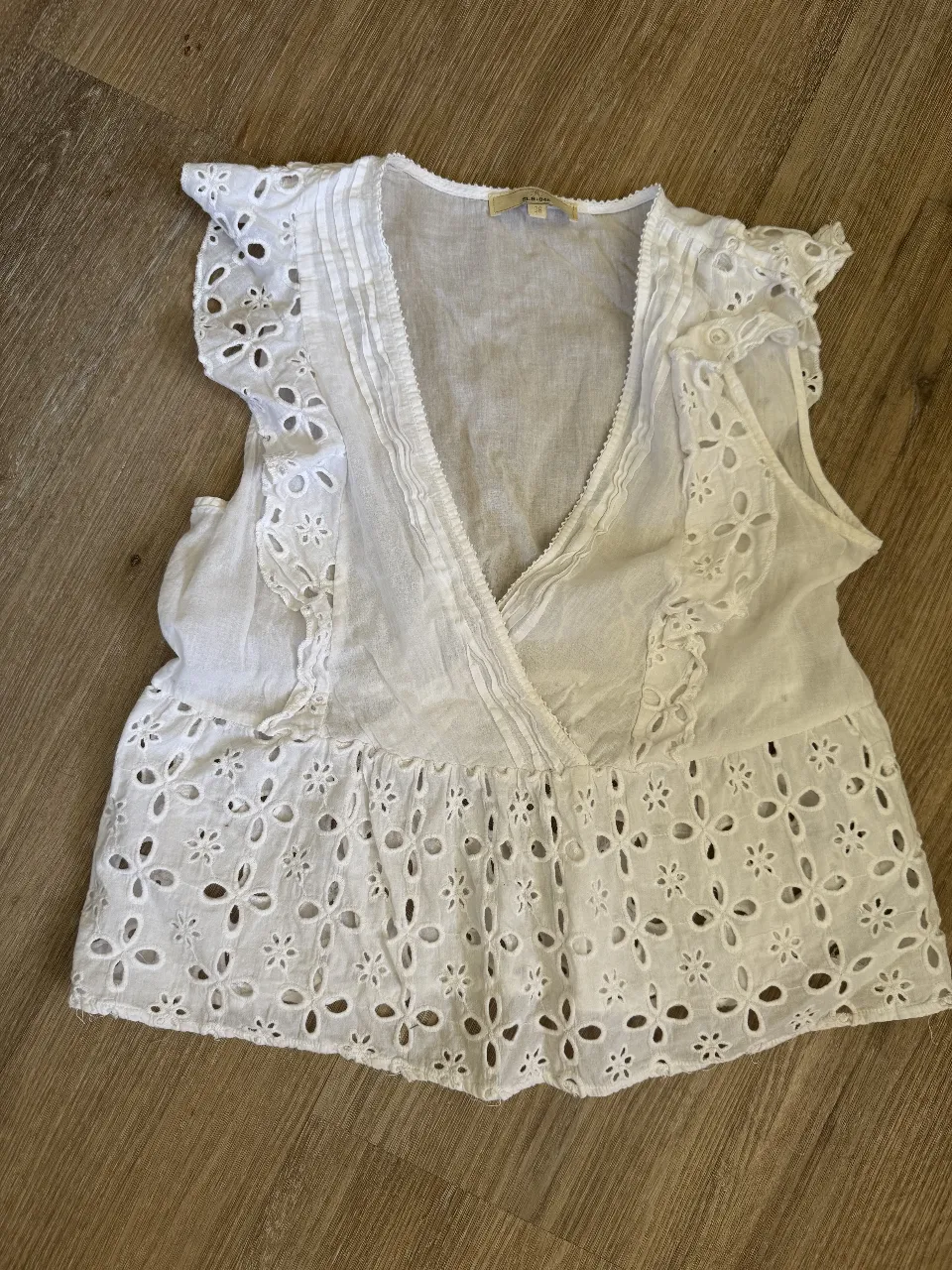 Blusa blanca con detalles de bordado y volados en las mangas. Escote en V cruzado y terminación con puntilla calada en la parte inferior. Ideal para un look fresco y romántico. Estilo Boho-chic