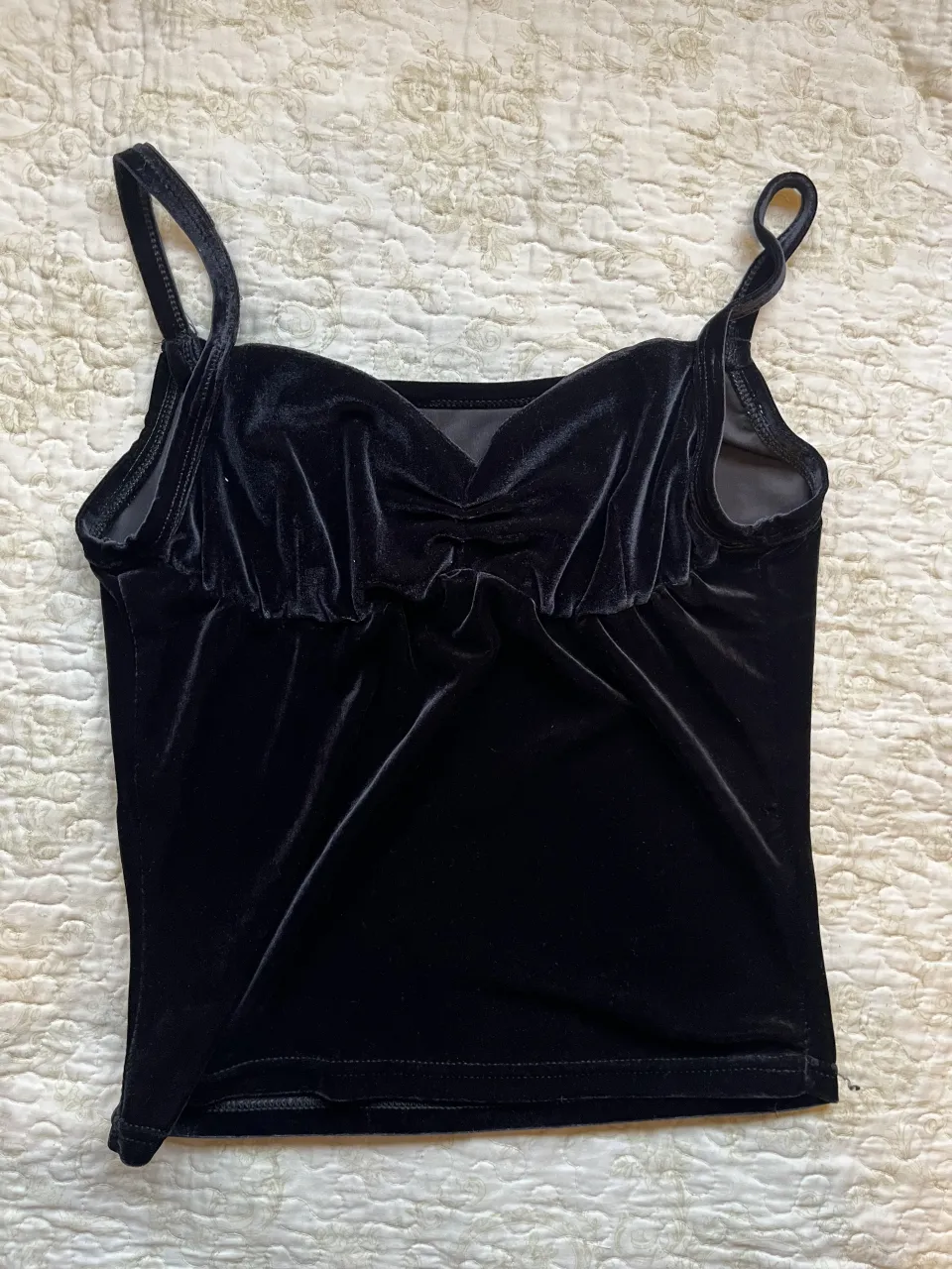 Top de terciopelo negro con tiras finas y detalle fruncido en el busto. Tiene elástico en la parte del busto, muy cómodo