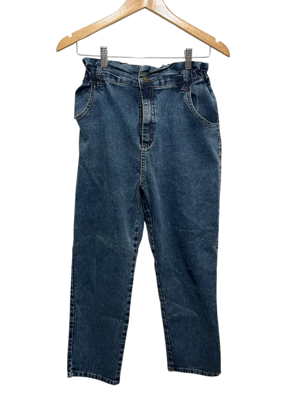 Jean de tiro alto con cintura fruncida y detalles de bolsillos. Un clásico que no puede faltar en tu guardarropa, ideal para combinar con tops o camisas.