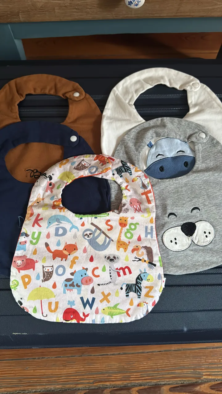 Lote de cuatro baberos para bebé. Uno es azul marino con borde marrón y cierre de broche. Otro es gris con un aplique de hipopótamo en la parte superior y un rostro de foca bordado en la parte inferior, con borde blanco y cierre de broche. El tercer babero es blanco con un estampado de abecedario y animales de la selva, con borde multicolor y cierre de broche. El cuarto babero es blanco con borde blanco y cierre de broche.