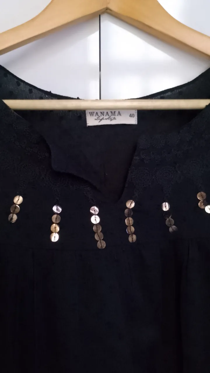 Remera negra con detalles de lentejuelas doradas y plateadas en el frente. Posee un estampado vibrante en la parte inferior con motivos circulares en coral y negro, acompañado de detalles plateados y lentejuelas. Las mangas y el cuello tienen un delicado tejido con pequeños puntos.
