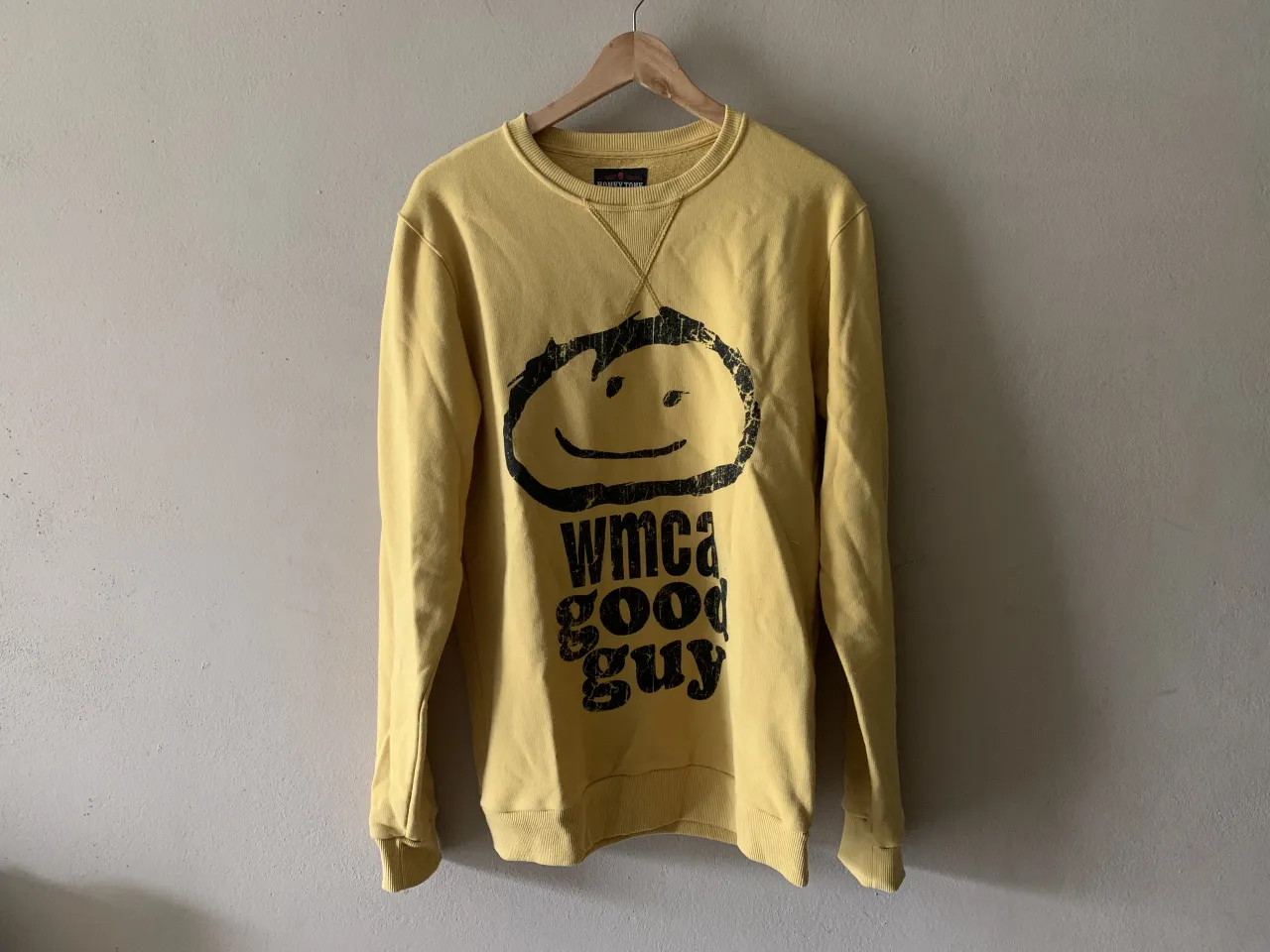 Buzo de cuello redondo. Confeccionado en rústico de algodón de alta calidad (sin friza), ideal para media estación o noches de verano. Diseño en color amarillo mostaza con estampa central icónica de estilo vintage y terminación gastada. Talle M. Estado impecable, el algodón conserva su estructura original y no presenta desgaste en puños ni cintura.