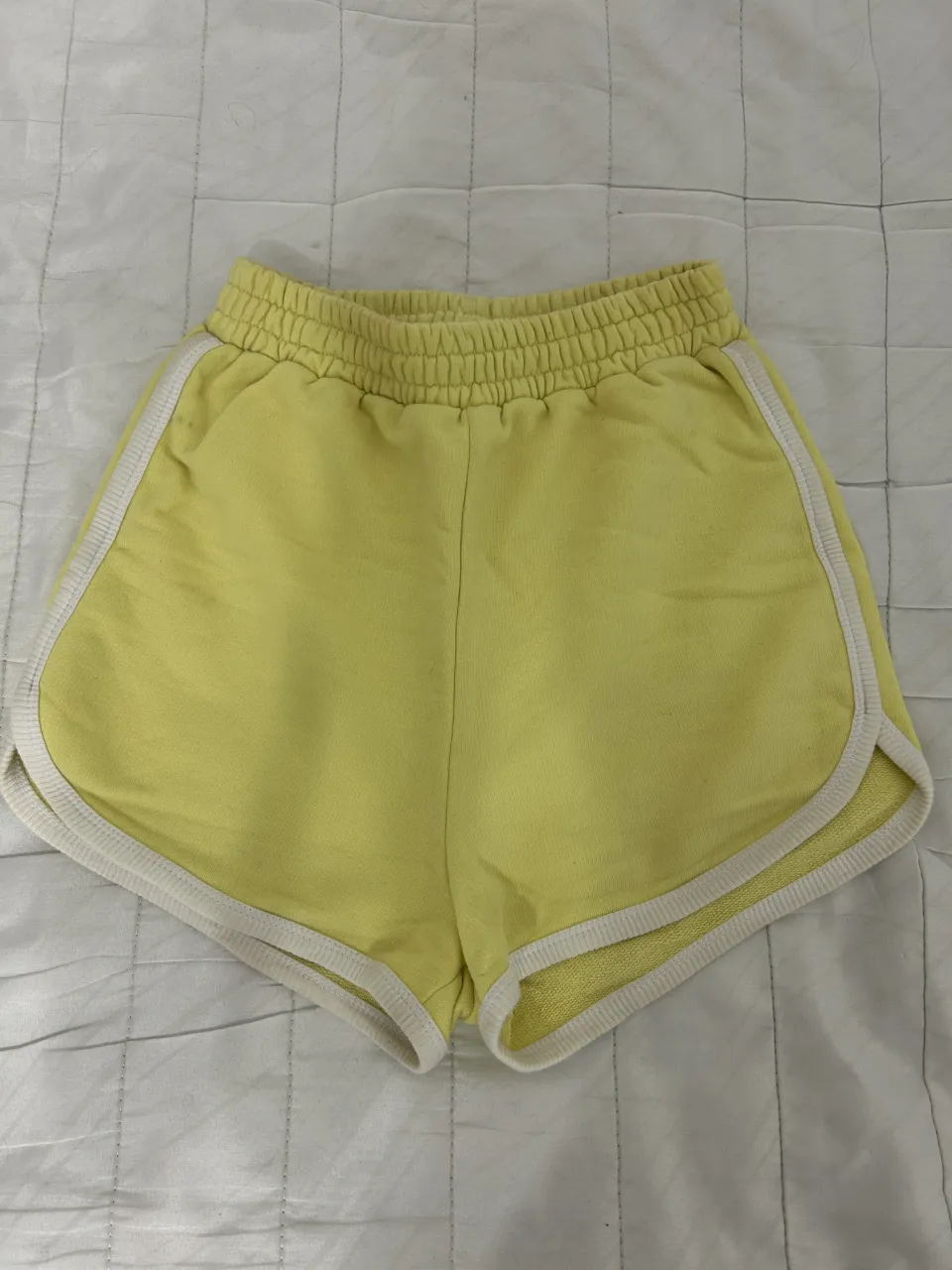 Shorts de algodón amarillo pastel con detalles blancos en los bordes. Cintura elastizada y corte deportivo, ideales para un look cómodo y canchero.