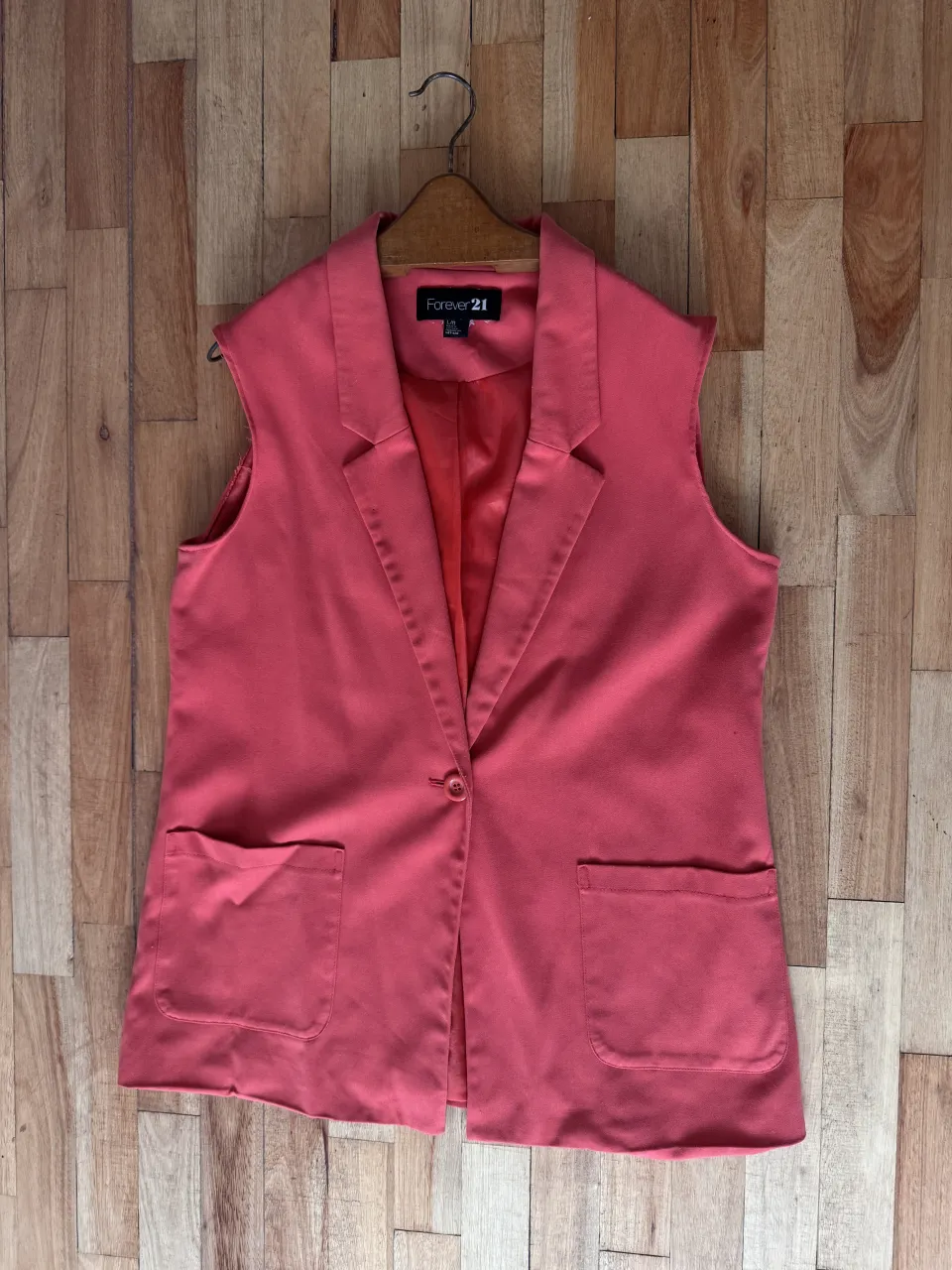 Chaleco blazer color coral, ideal para un look canchero y moderno. Perfecto para combinar con remeras básicas o camisas, dándole un toque chic a tu outfit. Con bolsillos funcionales y un corte que estiliza. Talle L