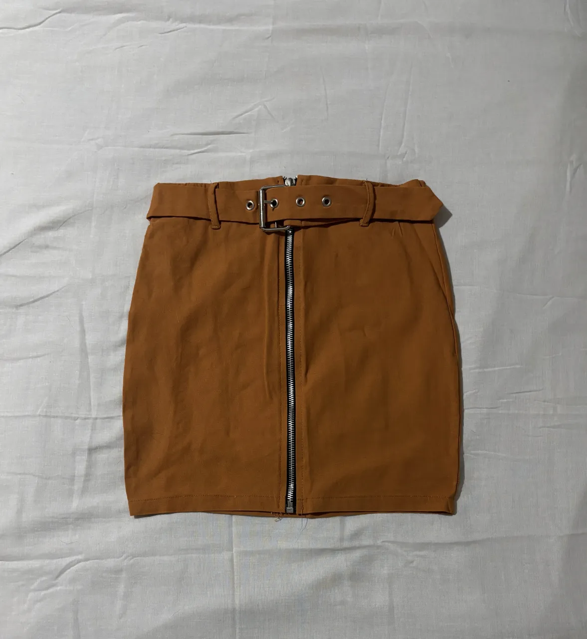 Pollera amarronada elastizada de tiro alto con cierre metálico al frente y detalle de cinturón con hebilla. Un básico que necesitas para crear looks variados.